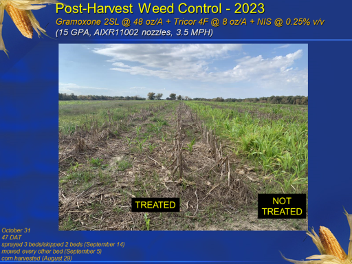 Post-Harvest Weed Control - 2023 Gramoxone 2SL @ 48 oz/A + Tricor 4F @ 8 oz/A + NIS @ 0.25% v/v (15 GPA, AIXR11002 nozzles, 3.5 MPH)<BR>October 31 <BR>47 DAT  <BR>sprayed 3 beds/skipped 2 beds (September 14) <BR>mowed every other bed (September 5) <BR>corn harvested (August 29)<BR>