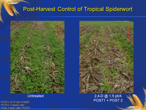 Post-Harvest Control of Tropical Spiderwort<BR>Untreated<BR>2,4-D @ 1.5 pt/A <BR>POST1 + POST 2<BR>POST1: 8-10” tall COMBE <BR>POST2: 2 weeks later <BR>Photo 1 week after POST2<BR>