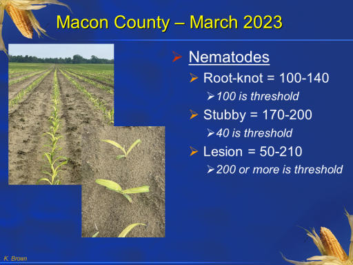 Macon County – March 2023<BR> Nematodes <BR> Root-knot = 100-140 <BR>100 is threshold <BR> Stubby = 170-200 <BR>40 is threshold <BR> Lesion = 50-210 <BR>200 or more is threshold <BR> <BR> <BR> <BR>K. Brown<BR>