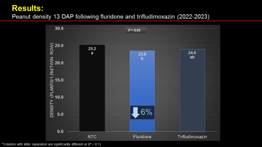 Results: <BR>Peanut density 13 DAP following fluridone and trifludimoxazin (2022-2023)<BR>P = 0.034<BR>*Columns with letter separation are significantly different at (P < 0.1)<BR>P = 0.03<BR>6%<BR>