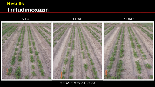 Results: <BR>Trifludimoxazin<BR>NTC<BR>30 DAP; May 31, 2023<BR>1 DAP<BR>7 DAP<BR>