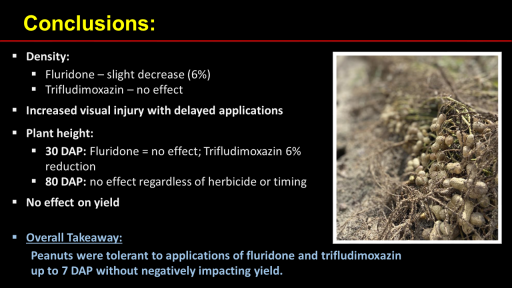 Conclusions:<BR>Density: <BR>Fluridone – slight decrease (6%) <BR>Trifludimoxazin – no effect <BR>Increased visual injury with delayed applications <BR>Plant height: <BR>30 DAP: Fluridone = no effect; Trifludimoxazin 6% reduction <BR>80 DAP: no effect regardless of herbicide or timing <BR>No effect on yield<BR>Overall Takeaway:  <BR>Peanuts were tolerant to applications of fluridone and trifludimoxazin up to 7 DAP without negatively impacting yield. <BR>