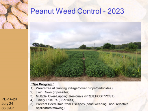 Peanut Weed Control - 2023<BR>PE-14-23 <BR>July 24 <BR>83 DAP<BR>“The Program” <BR>Weed-free at planting (tillage/cover crops/herbicides) <BR>Twin Rows (if possible) <BR>Multiple Over-Lapping Residuals (PRE/EPOST/POST) <BR>Timely POST’s (3” or less) <BR>Prevent Seed-Rain from Escapes (hand-weeding, non-selective applicators/mowing)<BR>
