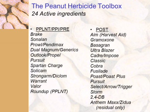 The Peanut Herbicide Toolbox 24 Active ingredients<BR>PPLNT/PPI/PRE <BR>Brake <BR>Sonalan <BR>Prowl/Pendimax <BR>Dual Magnum/Generics <BR>Outlook/Propel <BR>Pursuit <BR>Spartan Charge <BR>Solicam <BR>Strongarm/Diclom <BR>Warrant <BR>Valor <BR>Roundup (PPLNT) <BR>POST <BR>Aim (Harvest Aid) <BR>Gramoxone <BR>Basagran <BR>Ultra Blazer <BR>Cadre/Impose <BR>Classic <BR>Cobra <BR>Fusilade <BR>Poast/Poast Plus <BR>Pursuit <BR>Select/Arrow/Trigger <BR>Storm <BR>2,4-DB <BR>Anthem Maxx/Zidua  <BR>	(residual only) <BR>