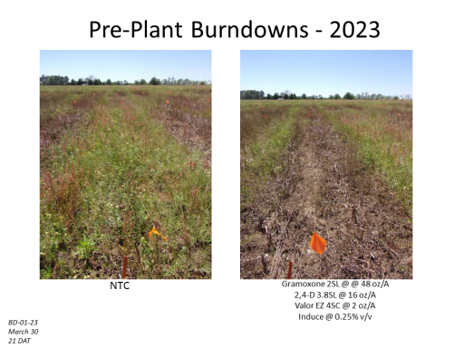 Pre-Plant Burndowns - 2023<BR>BD-01-23 <BR>March 30 <BR>21 DAT<BR>NTC<BR>Gramoxone 2SL @ @ 48 oz/A <BR>2,4-D 3.8SL @ 16 oz/A <BR>Valor EZ 4SC @ 2 oz/A <BR>Induce @ 0.25% v/v<BR>NTC<BR>