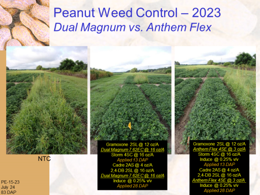 Peanut Weed Control – 2023 Dual Magnum vs. Anthem Flex<BR>PE-15-23 <BR>July 24 <BR>83 DAP<BR>NTC<BR>Gramoxone 2SL @ 12 oz/A <BR>Dual Magnum 7.62EC @ 16 oz/A <BR>Storm 4SC @ 16 oz/A <BR>Applied 13 DAP <BR>Cadre 2AS @ 4 oz/A <BR>2,4-DB 2SL @ 16 oz/A <BR>Dual Magnum 7.62EC @ 16 oz/A <BR>Induce @ 0.25% v/v <BR>Applied 28 DAP<BR>Gramoxone 2SL @ 12 oz/A <BR>Anthem Flex 4SE @ 3 oz/A <BR>Storm 4SC @ 16 oz/A <BR>Induce @ 0.25% v/v <BR>Applied 13 DAP <BR>Cadre 2AS @ 4 oz/A <BR>2,4-DB 2SL @ 16 oz/A <BR>Anthem Flex 4SE @ 3 oz/A  <BR>Induce @ 0.25% v/v <BR>Applied 28 DAP<BR>