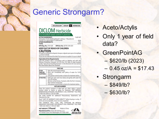 Generic Strongarm?<BR>Aceto/Actylis <BR>Only 1 year of field  data? <BR>GreenPointAG <BR>$620/lb (2023) <BR>0.45 oz/A = $17.43 <BR>Strongarm <BR>$849/lb? <BR>$630/lb? 	<BR>