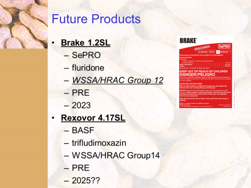 Future Products<BR>Brake 1.2SL <BR>SePRO <BR>fluridone <BR>WSSA/HRAC Group 12 <BR>PRE <BR>2023 <BR>Rexovor 4.17SL <BR>BASF <BR>trifludimoxazin <BR>WSSA/HRAC Group14 <BR>PRE <BR>2025??<BR>