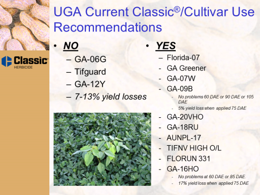 UGA Current ClassicŪ/Cultivar Use Recommendations<BR>NO <BR>GA-06G <BR>Tifguard <BR>GA-12Y <BR>7-13% yield losses<BR>YES <BR>Florida-07 <BR>GA Greener <BR>GA-07W <BR>GA-09B <BR>No problems 60 DAE or 90 DAE or 105 DAE <BR>5% yield loss when applied 75 DAE <BR>GA-20VHO <BR>GA-18RU <BR>AUNPL-17 <BR>TIFNV HIGH O/L <BR>FLORUN 331 <BR>GA-16HO <BR>No problems at 60 DAE or 85 DAE. <BR>17% yield loss when applied 75 DAE<BR>