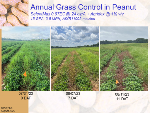 Annual Grass Control in Peanut SelectMax 0.97EC @ 24 oz/A + Agridex @ 1% v/v 15 GPA, 3.5 MPH, AIXR11002 nozzles <BR>Schley Co. <BR>August 2023<BR>07/31/23 <BR>0 DAT<BR>08/07/23 <BR>7 DAT<BR>08/11/23 <BR>11 DAT<BR>