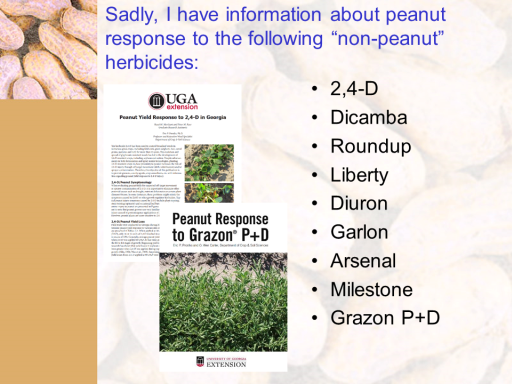Sadly, I have information about peanut response to the following “non-peanut” herbicides:<BR>2,4-D <BR>Dicamba <BR>Roundup <BR>Liberty <BR>Diuron <BR>Garlon <BR>Arsenal <BR>Milestone <BR>Grazon P+D<BR>