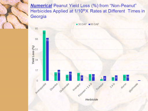 Numerical Peanut Yield Loss (%) from “Non-Peanut” Herbicides Applied at 1/10thX Rates at Different  Times in Georgia<BR>