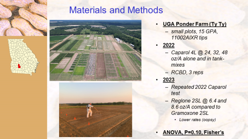 Materials and Methods<BR>UGA Ponder Farm (Ty Ty) <BR>small plots, 15 GPA, 11002AIXR tips <BR>2022 <BR>Caparol 4L @ 24, 32, 48 oz/A alone and in tank-mixes <BR>RCBD, 3 reps <BR>2023 <BR>Repeated 2022 Caparol test <BR>Reglone 2SL @ 6.4 and 8.6 oz/A compared to Gramoxone 2SL  <BR>Lower rates (oopsy)  <BR> <BR>ANOVA, P=0.10, Fisher’s <BR>