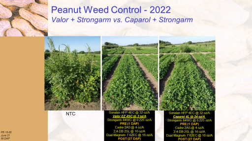 Peanut Weed Control - 2022 Valor + Strongarm vs. Caparol + Strongarm<BR>PE-12-22 <BR>June 21 <BR>55 DAP<BR>NTC<BR>Sonalan HFP 4EC @ 32 oz/A <BR>Valor EZ 4SC @ 3 oz/A <BR>Strongarm 84WG @ 0.225 oz/A <BR>PRE (1 DAP) <BR>Cadre 2AS @ 4 oz/A <BR>2,4-DB 2SL @ 16 oz/A <BR>Dual Magnum 7.62EC @ 16 oz/A <BR>POST (27 DAP)<BR>Sonalan HFP 4EC @ 32 oz/A <BR>Caparol 4L @ 24 oz/A  <BR>Strongarm 84WG @ 0.225 oz/A <BR>PRE (1 DAP) <BR>Cadre 2AS @ 4 oz/A <BR>2,4-DB 2SL @ 16 oz/A <BR>Dual Magnum 7.62EC @ 16 oz/A <BR>POST (27 DAP)<BR>