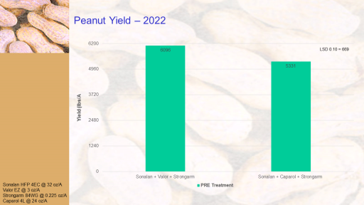 Peanut Yield – 2022 <BR>Sonalan HFP 4EC @ 32 oz/A <BR>Valor EZ @ 3 oz/A <BR>Strongarm 84WG @ 0.225 oz/A <BR>Caparol 4L @ 24 oz/A<BR>
