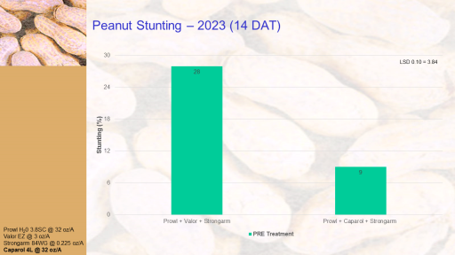Peanut Stunting – 2023 (14 DAT)<BR>Prowl H20 3.8SC @ 32 oz/A <BR>Valor EZ @ 3 oz/A <BR>Strongarm 84WG @ 0.225 oz/A <BR>Caparol 4L @ 32 oz/A<BR>
