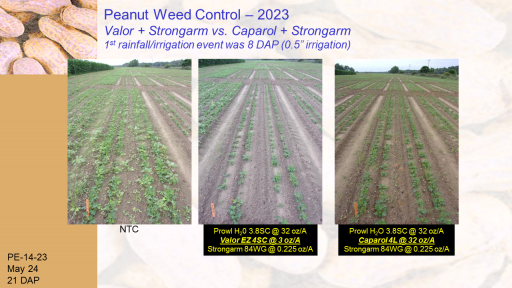 Peanut Weed Control – 2023 Valor + Strongarm vs. Caparol + Strongarm 1st rainfall/irrigation event was 8 DAP (0.5” irrigation)<BR>PE-14-23 <BR>May 24 <BR>21 DAP<BR>NTC<BR>Prowl H20 3.8SC @ 32 oz/A <BR>Valor EZ 4SC @ 3 oz/A <BR>Strongarm 84WG @ 0.225 oz/A<BR>Prowl H2O 3.8SC @ 32 oz/A <BR>Caparol 4L @ 32 oz/A <BR>Strongarm 84WG @ 0.225 oz/A<BR>