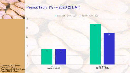 Peanut Injury (%) – 2023 (2 DAT)<BR>Gramoxone 2SL @ 12 oz/A <BR>Storm 4SL @ 16 oz/A <BR>Dual Magnum 7.62EC @ 16 oz/A <BR>Reglone 2SL @ 8.6 oz/A<BR>(LSD 0.10 = 2.45)<BR>(LSD 0.10 = 2.82)<BR>