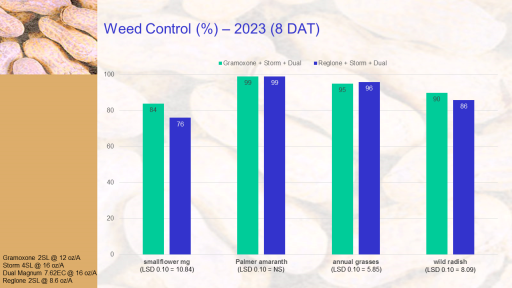 Weed Control (%) – 2023 (8 DAT)<BR>Gramoxone 2SL @ 12 oz/A <BR>Storm 4SL @ 16 oz/A <BR>Dual Magnum 7.62EC @ 16 oz/A <BR>Reglone 2SL @ 8.6 oz/A<BR>(LSD 0.10 = 10.84)<BR>(LSD 0.10 = NS)<BR>(LSD 0.10 = 5.85)<BR>(LSD 0.10 = 8.09)<BR>