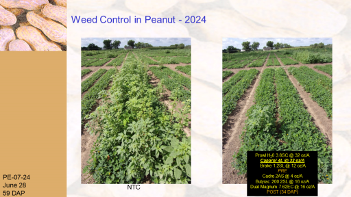 Weed Control in Peanut - 2024<BR>PE-07-24 <BR>June 28 <BR>59 DAP<BR>NTC<BR>Prowl H20 3.8SC @ 32 oz/A <BR>Caparol 4L @ 32 oz/A <BR> Brake 1.2SL @ 12 oz/A <BR>PRE <BR>Cadre 2AS @ 4 oz/A <BR>Butyrac 200 2SL @ 16 oz/A <BR>Dual Magnum 7.62EC @ 16 oz/A <BR>POST (34 DAP)<BR>