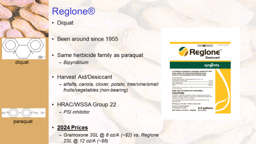 Reglone® <BR>Diquat <BR> <BR>Been around since 1955 <BR> <BR>Same herbicide family as paraquat <BR>Bipyridilium <BR> <BR>Harvest Aid/Desiccant <BR>alfalfa, canola, clover, potato, tree/vine/small fruits/vegetables (non-bearing) <BR> <BR>HRAC/WSSA Group 22 <BR>PSI inhibitor <BR> <BR>2024 Prices <BR>Gramoxone 3SL @ 8 oz/A (~$2) vs. Reglone 2SL @ 12 oz/A (~$8) <BR> <BR>diquat<BR>paraquat<BR>