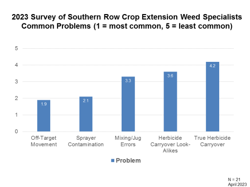 2023 Survey of Southern Row Crop Extension Weed Specialists Common Problems (1 = most common, 5 = least common)<BR>N = 21 <BR>April 2023<BR>