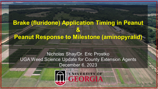 Brake (fluridone) Application Timing in Peanut & Peanut Response to Milestone (aminopyralid)  Nicholas Shay/Dr. Eric Prostko UGA Weed Science Update for County Extension Agents December 6, 2023<BR>