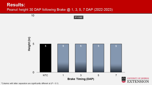 Results: <BR>Peanut height 30 DAP following Brake @ 1, 3, 5, 7 DAP (2022-2023)<BR>P = 0.62<BR>*Columns with letter separation are significantly different at (P < 0.1)<BR>