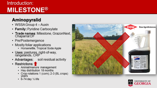 Aminopyralid <BR>WSSA Group 4 – Auxin <BR>Family: Pyridine Carboxylate <BR>Trade names: Milestone, GrazonNext, Chaparral DF <BR>Pre/Postemergence <BR>Mostly foliar applications <BR>Horsenettle, Tropical Soda Apple <BR>Uses: pastures, right-of-way, rangelands, CRP <BR>Advantages:     soil residual activity <BR>Restrictions: <BR>Animal/manure management <BR>Hay distribution 18 months <BR>Crop rotations 1 (corn); 2-3 (BL crops) years <BR>6-74 day ½ life <BR>Introduction: <BR>MILESTONE®<BR>
