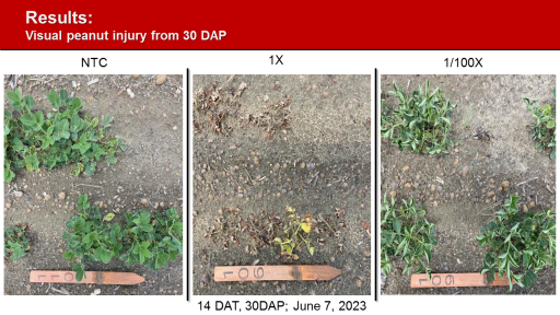 Results: <BR>Visual peanut injury from 30 DAP<BR>14 DAT, 30DAP; June 7, 2023<BR>1X<BR>1/100X<BR>NTC<BR>