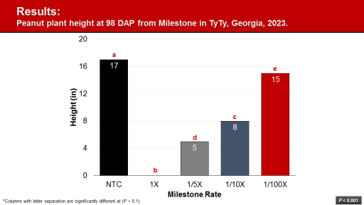 Results: <BR>Peanut plant height at 98 DAP from Milestone in TyTy, Georgia, 2023.<BR>P < 0.001<BR>*Columns with letter separation are significantly different at (P < 0.1)<BR>b<BR>d<BR>c<BR>e<BR>a<BR>
