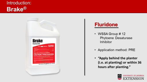 Introduction: <BR>Brake®<BR>Fluridone <BR> <BR>WSSA Group # 12 <BR>Phytoene Desaturase Inhibitor <BR> <BR>Application method: PRE <BR> <BR>“Apply behind the planter (i.e. at planting) or within 36 hours after planting.” <BR>