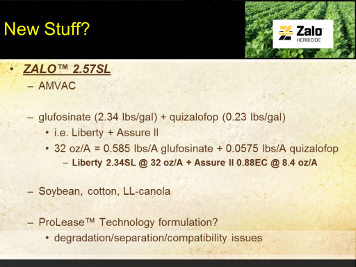 New Stuff?<BR>ZALO™ 2.57SL <BR>AMVAC <BR> <BR>glufosinate (2.34 lbs/gal) + quizalofop (0.23 lbs/gal) <BR>i.e. Liberty + Assure II <BR>32 oz/A = 0.585 lbs/A glufosinate + 0.0575 lbs/A quizalofop <BR>Liberty 2.34SL @ 32 oz/A + Assure II 0.88EC @ 8.4 oz/A <BR> <BR>Soybean, cotton, LL-canola <BR> <BR>ProLease™ Technology formulation? <BR>degradation/separation/compatibility issues<BR>