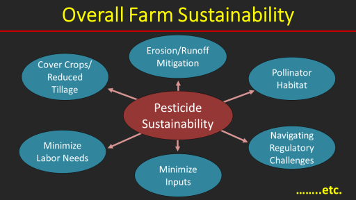 Cover Crops/ <BR>Reduced Tillage<BR>Erosion/Runoff Mitigation<BR>Pollinator Habitat<BR>Minimize Labor Needs<BR>Minimize Inputs<BR>Navigating Regulatory Challenges<BR>Overall Farm Sustainability<BR>……..etc.<BR>Pesticide Sustainability<BR>