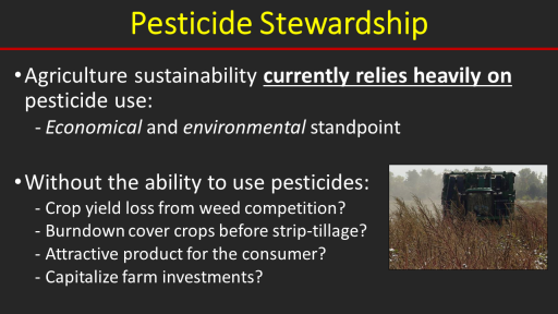 Agriculture sustainability currently relies heavily on pesticide use:  <BR>Economical and environmental standpoint <BR> <BR>Without the ability to use pesticides:  <BR>Crop yield loss from weed competition? <BR>Burndown cover crops before strip-tillage? <BR>Attractive product for the consumer? <BR>Capitalize farm investments? <BR> <BR> <BR> <BR>Pesticide Stewardship<BR>