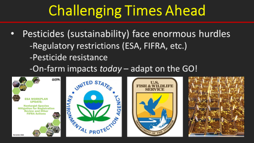 Challenging Times Ahead<BR>Pesticides (sustainability) face enormous hurdles <BR>Regulatory restrictions (ESA, FIFRA, etc.) <BR>Pesticide resistance <BR>On-farm impacts today – adapt on the GO! <BR>