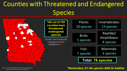 Counties with Threatened and Endangered Species <BR>Source: U.S. Fish & Wildlife Service Environmental Conservation Online System (ECOS). https://ecos.fws.gov/ecp/<BR>Counties with threatened/ endangered species highlighted in red.<BR>*Remember, it’s the species AND its habitat<BR>140 out of 159 counties have threatened/ endangered species <BR>