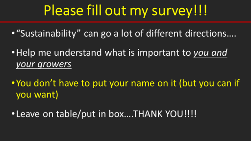 “Sustainability” can go a lot of different directions…. <BR> <BR>Help me understand what is important to you and your growers <BR> <BR>You don’t have to put your name on it (but you can if you want) <BR> <BR>Leave on table/put in box….THANK YOU!!!! <BR> <BR> <BR> <BR> <BR> <BR>Please fill out my survey!!!<BR>