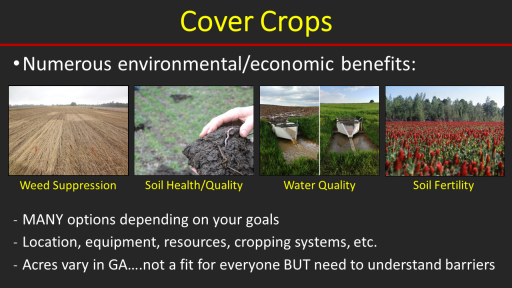 Numerous environmental/economic benefits: <BR> <BR> <BR>Cover Crops<BR>MANY options depending on your goals <BR>Location, equipment, resources, cropping systems, etc. <BR>Acres vary in GA….not a fit for everyone BUT need to understand barriers  <BR> <BR>