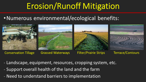 Numerous environmental/ecological benefits: <BR> <BR> <BR>Erosion/Runoff Mitigation<BR>Conservation Tillage<BR>Grassed Waterways<BR>Filter/Prairie Strips<BR>Terrace/Contours<BR>Landscape, equipment, resources, cropping system, etc. <BR>Support overall health of the land and the farm <BR>Need to understand barriers to implementation <BR> <BR> <BR>