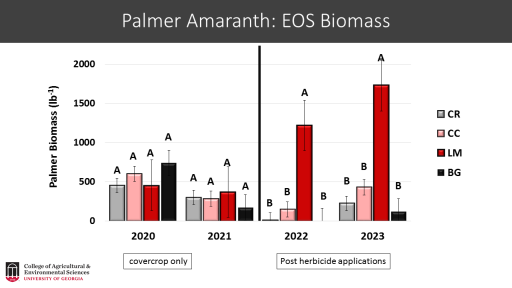 Palmer Amaranth: EOS Biomass<BR>Post herbicide applications<BR> covercrop only<BR>