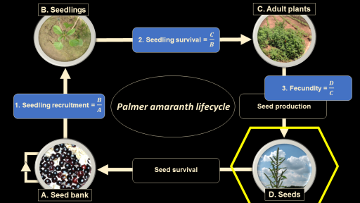 D. Seeds<BR>B. Seedlings<BR>A. Seed bank<BR>C. Adult plants<BR>Seed survival<BR>Seed production<BR>Palmer amaranth lifecycle<BR>