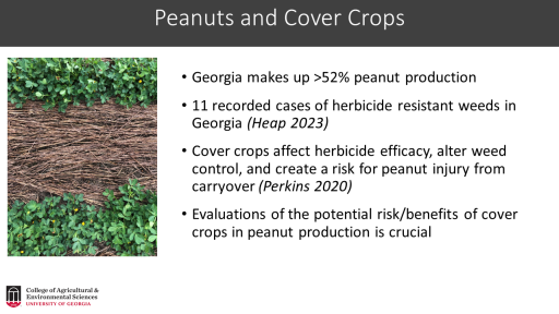 Georgia makes up >52% peanut production <BR>11 recorded cases of herbicide resistant weeds in Georgia (Heap 2023) <BR>Cover crops affect herbicide efficacy, alter weed control, and create a risk for peanut injury from carryover (Perkins 2020) <BR>Evaluations of the potential risk/benefits of cover crops in peanut production is crucial <BR>Peanuts and Cover Crops <BR>