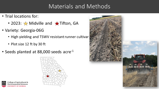 Trial locations for: <BR>2023:       Midville and       Tifton, GA <BR>Variety: Georgia-06G <BR>High yielding and TSWV resistant runner cultivar  <BR>Plot size 12 ft by 30 ft <BR>Seeds planted at 88,000 seeds acre-1 <BR>Materials and Methods<BR>