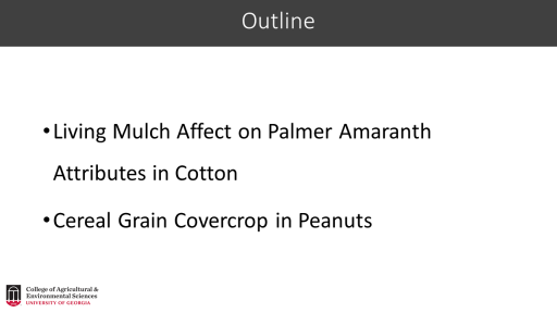 Living Mulch Affect on Palmer Amaranth Attributes in Cotton <BR>Cereal Grain Covercrop in Peanuts<BR>Outline<BR>