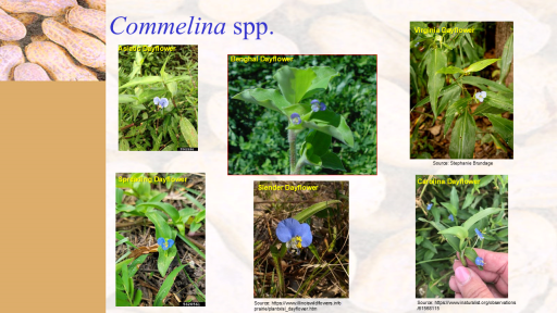 Commelina spp.<BR>Asiatic Dayflower<BR>Spreading Dayflower<BR>Benghal Dayflower<BR>Slender Dayflower<BR>Source: Stephanie Brundage<BR>Virginia Dayflower<BR>Source: https://www.illinoiswildflowers.info/ <BR>prairie/plantx/sl_dayflower.htm<BR>Carolina Dayflower<BR>Source: https://www.inaturalist.org/observations <BR>/61568115<BR>