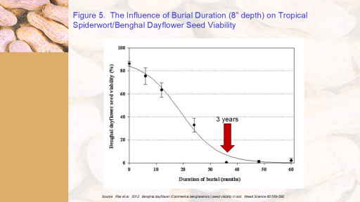Figure 5.  The Influence of Burial Duration (8” depth) on Tropical Spiderwort/Benghal Dayflower Seed Viability<BR>Source:  Riar et al.  2012.  Benghal dayflower (Commelina benghalensis ) seed viability in soil.  Weed Science 60:589-592.<BR>3 years<BR>
