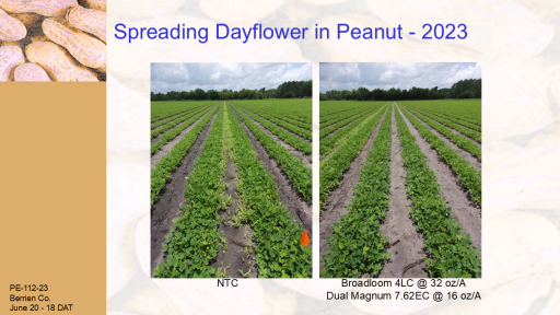 Spreading Dayflower in Peanut - 2023<BR>PE-112-23 <BR>Berrien Co. <BR>June 20 - 18 DAT<BR>NTC<BR>Broadloom 4LC @ 32 oz/A <BR>Dual Magnum 7.62EC @ 16 oz/A<BR>