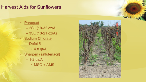 Harvest Aids for Sunflowers<BR>Paraquat <BR>2SL (19-32 oz/A <BR>3SL (13-21 oz/A)  <BR>Sodium Chlorate <BR>Defol 5  <BR>4.8 qt/A <BR>Sharpen (saflufenacil) <BR>1-2 oz/A <BR>MSO + AMS<BR>