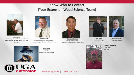 Know Who to Contact (Your Extension Weed Science Team)<BR>Eric Prostko <BR>Peanuts, soybeans, field corn, sunflowers, grain sorghum, sesame, canola, field pea, sugarcane<BR>Mark Czarnota <BR>Ornamentals, small fruits, nursery,  <BR>landscape, greenhouse, Christmas  Trees<BR>Stanley Culpepper <BR>Cotton, small grains,  <BR>vegetable crops (including sweet corn)<BR>New Hire <BR>Turf <BR>Interviews completed <BR>Wayne Mitchem <BR>Tree fruits <BR>(NCSU)<BR>Lisa Baxter <BR>Pastures/Forages<BR>Bob Stougaard <BR>Pastures/Forages<BR>